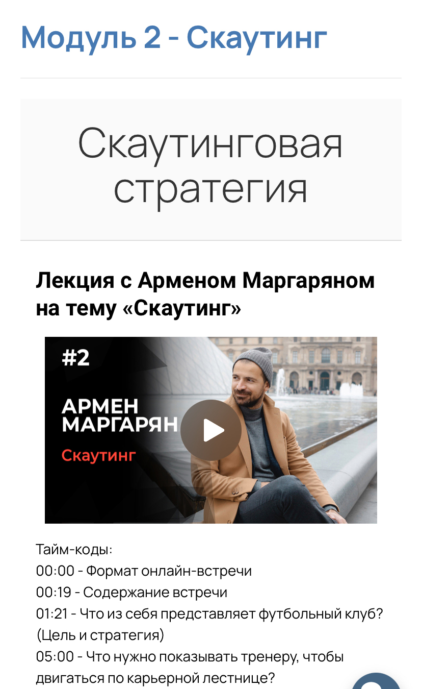 Итогом обучения является дипломный проект, составленный из заданий по всем учебным модулям. Он нацелен на освоение инструментов, которые необходимы в работы с командой. Все задания выполняются на основе реальной работы с клубом или спортивным коллективом.